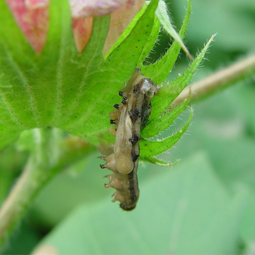 害蟲被病毒感染后,患病初期無(wú)明顯異常變化,漸而行動(dòng)遲緩,體色變淡,如變黃或發(fā)白體色呈油光。病蟲常爬向寄主植物高處,死前體軀變軟,體內(nèi)組織液化,往往以腹足緊附枝葉倒掛而死。液化體液下墜,使軀體前部膨大,體壁則脆弱易裂,破后流出乳白色或褐色的濃稠液體,內(nèi)含大量新形成的核型多角體病毒。
